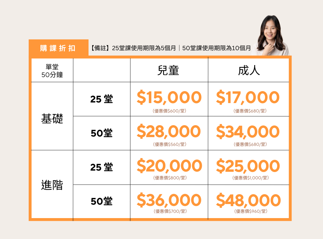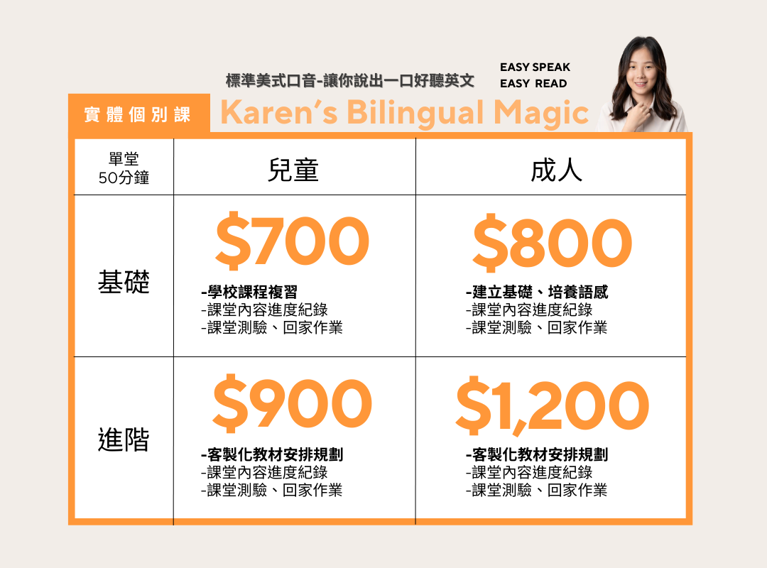 兒童課程 -採用Oxford 牛津教材且附課堂內容筆記 基礎自然發音到進階自然發音 全英文或中英文授課皆可 -基礎文法、句型結構: 透過學習生活實用句子引導學生做出句子的不同變化,再搭配口說和題目的練習來加深印象 -教學風格: 互動型教學和使用引導句型讓小朋友可以主動開口說英文 成人課程 -生活實用主題類型採用客製化教材 -附課堂內容,方便回家複習 基礎會話課-輕鬆聽得懂: 不用背單字也可以累積詞彙量,使用多種類型的生活主題教學搭配情境式教學讓你融入英文環境,教你聽得懂人家在說什麼 進階會話課-輕鬆開口說: 標準的美式口音,教你說好聽的英文。擺脫中式英文的思考邏輯,說出道地的英文,不再說用中翻英的英文。